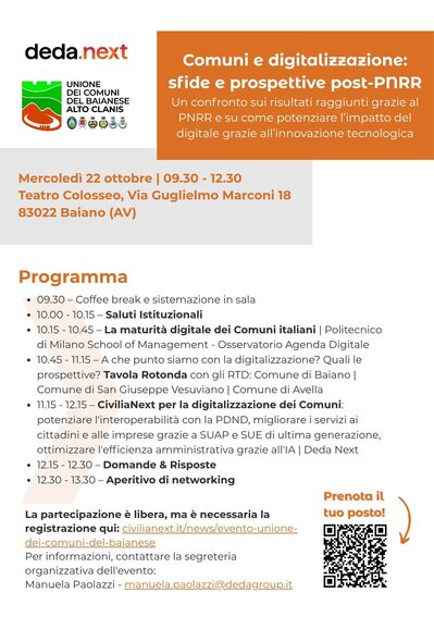La mattinata è dedicata ai Responsabili per la Transizione Digitale (RTD), Responsabili dei Sistemi Informativi o del CED dei Comuni, ma anche a Sindaci, Assessori e Dirigenti interessati al tema. Sarà un momento stimolante e dinamico, dove ascoltare non una singola voce, ma l'intervento di una figura autorevole del mondo accademico, le testimonianze di rappresentanti di amministrazioni locali di diverse dimensioni e proposte concrete per i Comuni che vogliono potenziare l'impatto della digitalizzazione per rispondere in modo più efficiente alle esigenze dei cittadini e delle imprese.